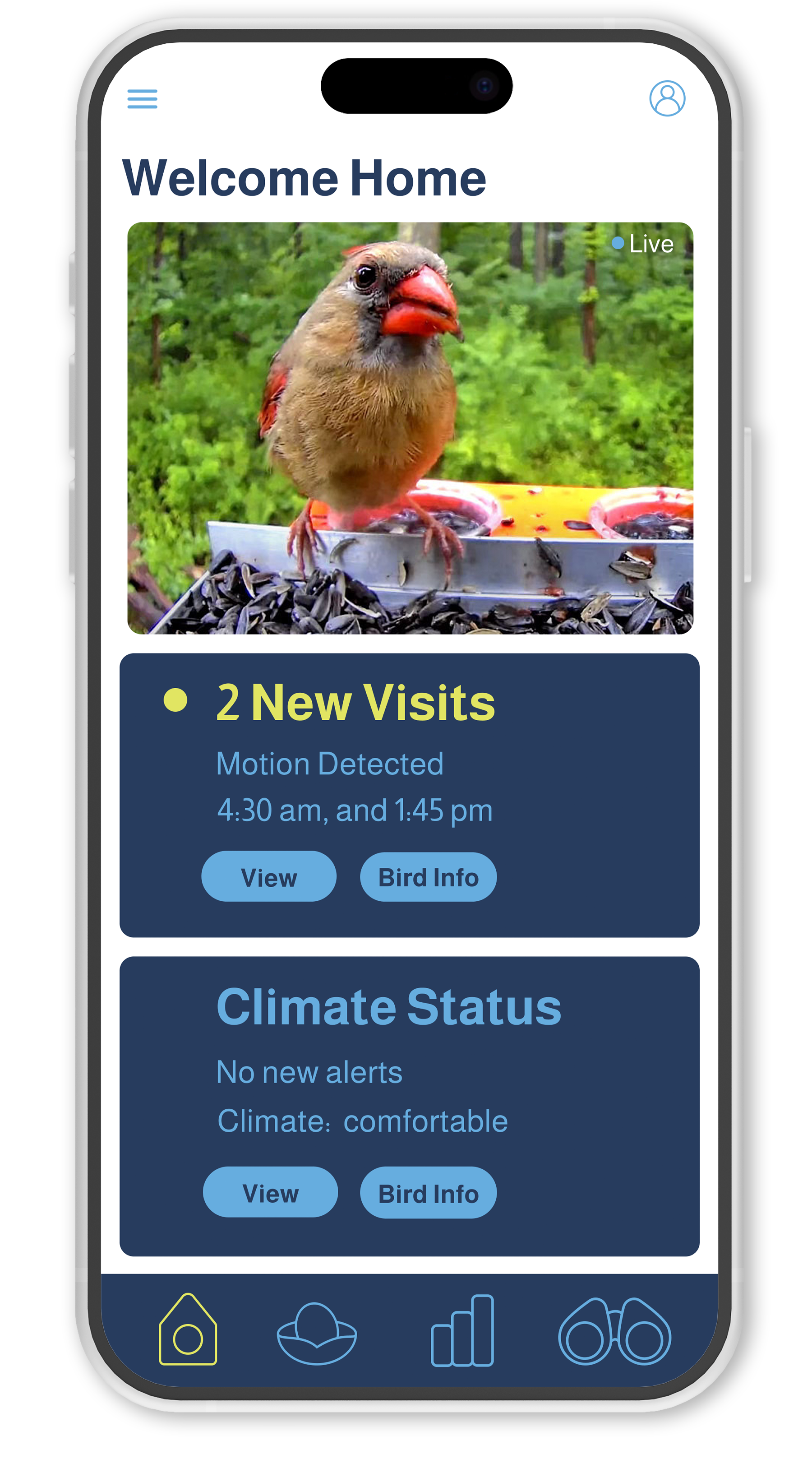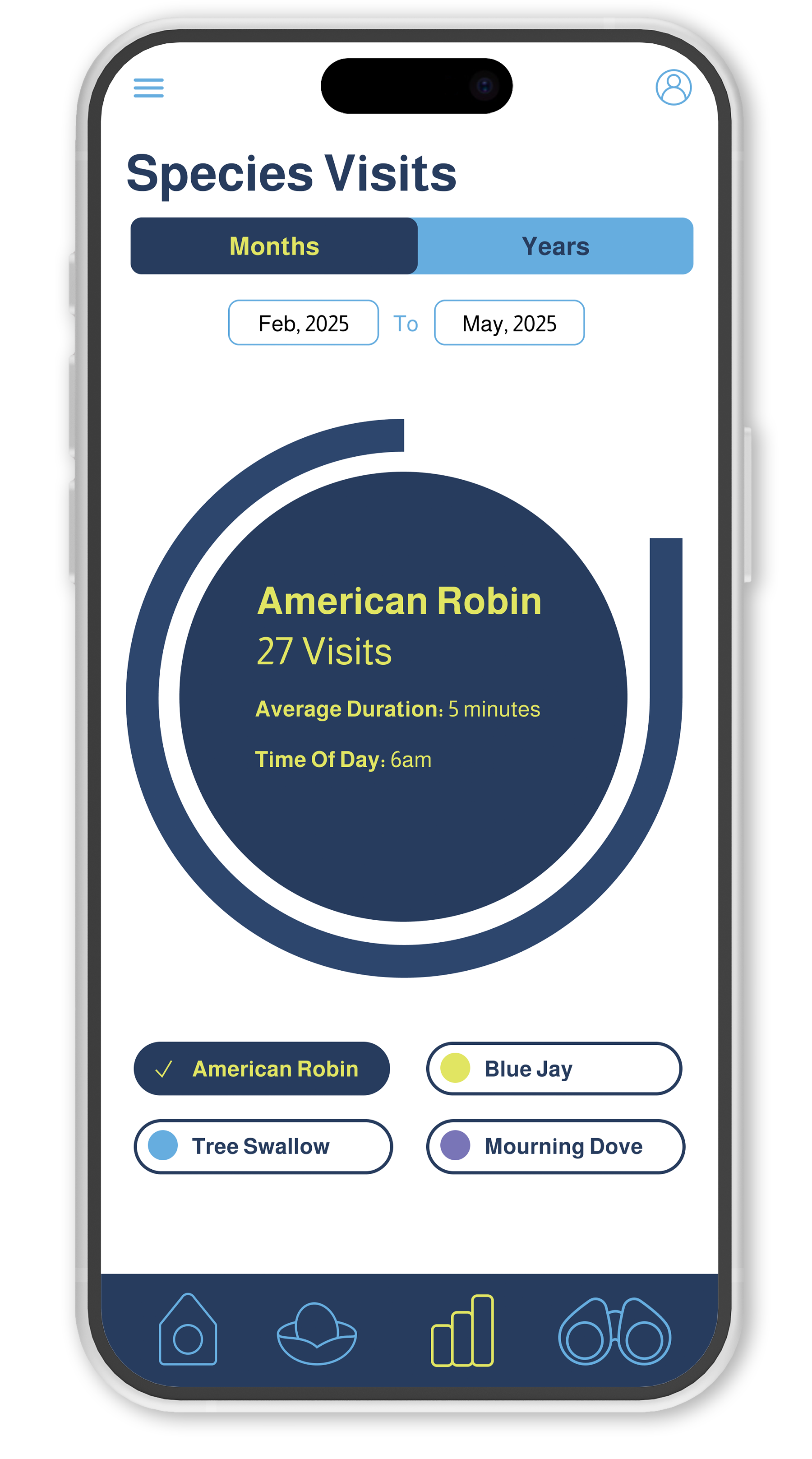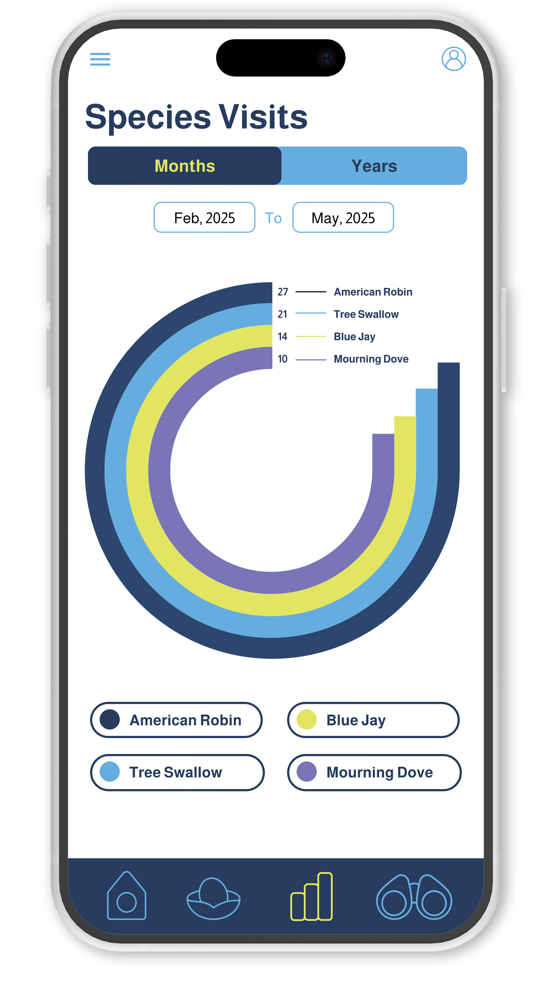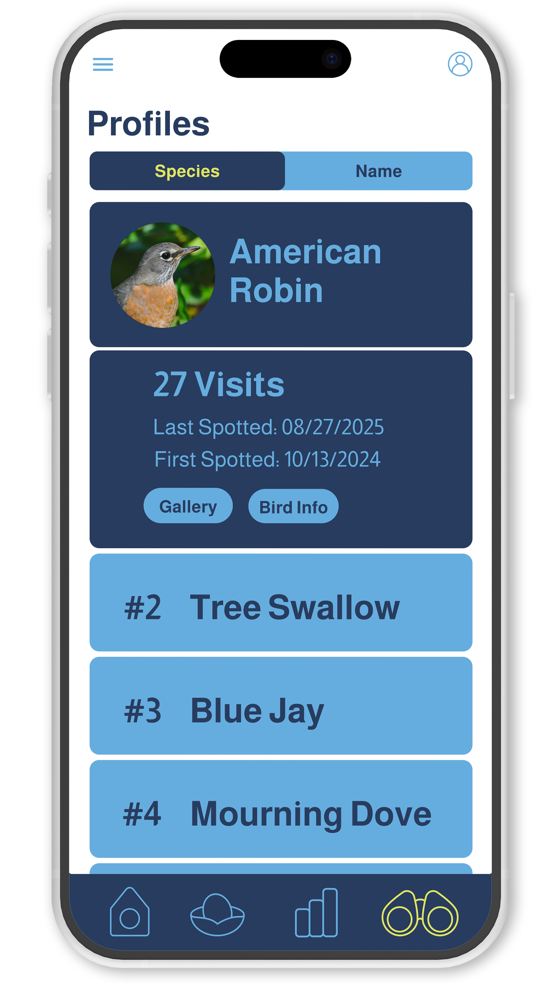 Wingo is a companion app for a smart birdhouse that helps you get to know the birds that stop by. It automatically identifies visiting species, logs each sighting, and builds unique profiles so you can track patterns over time. With clear visuals and easy-to-read data, Wingo turns casual birdwatching into an engaging, personalized experience.