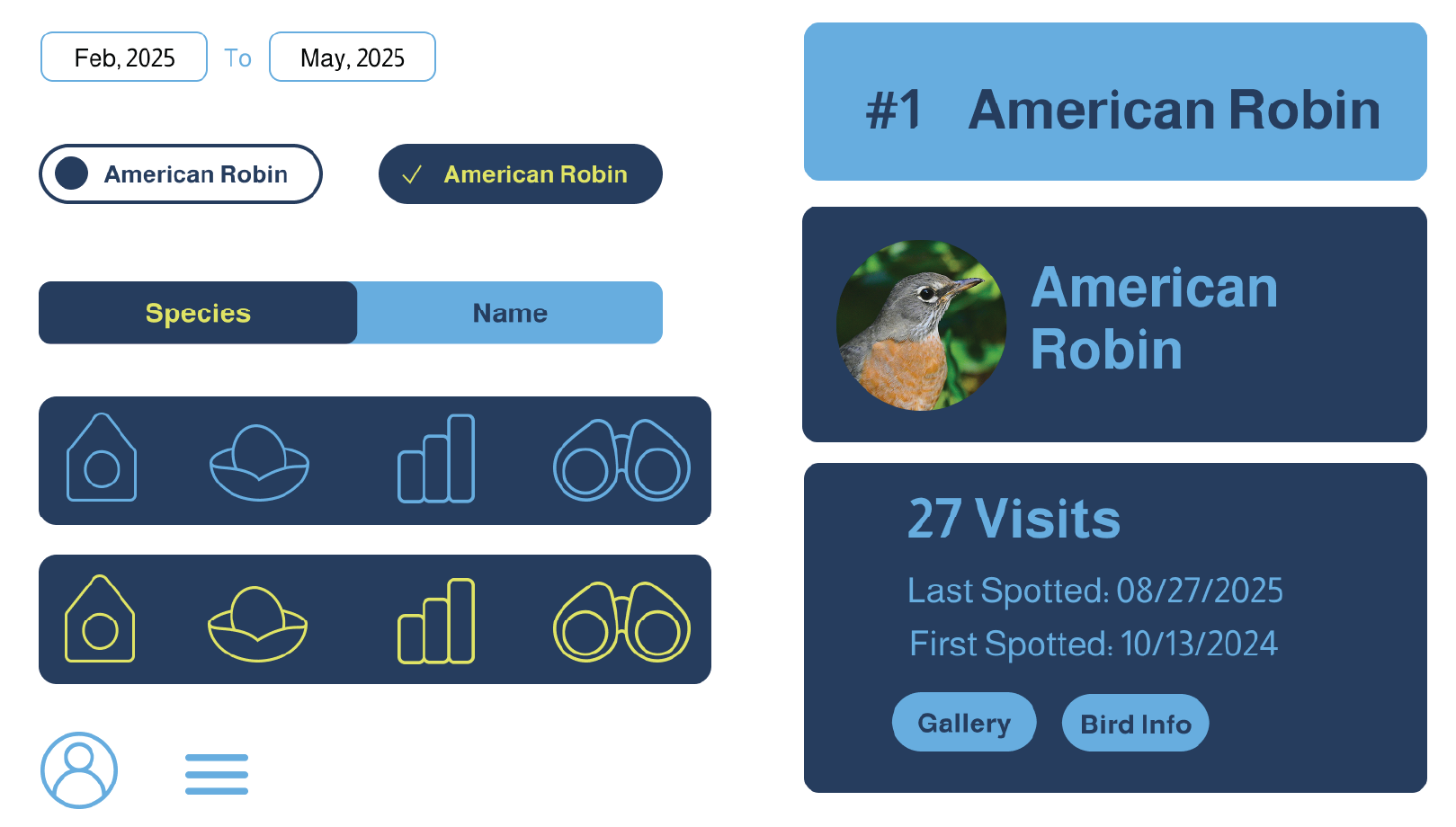 Wingo’s UI elements are designed to feel clean, friendly, and intuitive, making bird tracking easy for users of all experience levels. Simple iconography helps distinguish features like climate controls, bird data, and profiles. Altogether, the UI supports a smooth, engaging experience that keeps the focus on discovering and understanding each bird visitor.